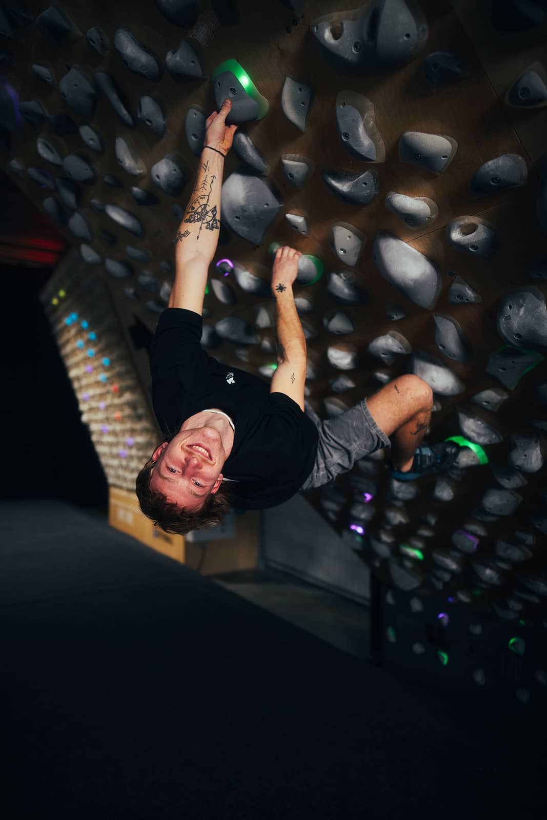 Für Sessions die ausarten. Das Quantum Board ist unsere 4,5 × 4,5 m große Boulderwand, mit 641 LED-geführten Griffen, verstellbarem Winkel (25°–60°) und Multi-Player-Mode für die maximale Abwechslung.